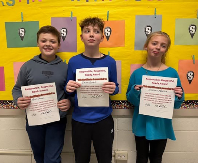 5th/6th grade Lunch with the Principal drawing winners- Alex Duclos, Easton Guyer and Whitney Martin. Photo by Jon Rehder. Click on the photo for a larger view.