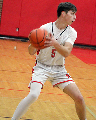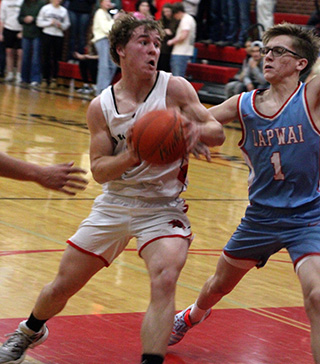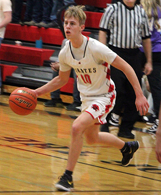 the end of the first quarter. Kendrick scored to make it 6-23 then Prairie put together a 19-3 run to cut their deficit to just 1 at 25-26.Shears hit a short jumper from the side. Schwartz then made back-to-back 3’s. Schlader scored a putback and Shears hit a 3 for a 13-0 run that cut the lead to 4 at 19-23. After a 3 by Kendrick, Forsmann hit back to back lay-ups and Shears scored from 16 feet to cut the lead to 1 with 1:40 left in the half. Kendrick then broke the momentum with back-to-back 3’s. Shears was fouled on a 3-point attempt at the end of the half and hit 2 of 3 at the line to make it 27-32 at halftime. Kendrick pushed the lead back to 10 in the third quarter with a 2-7 run. Schlader’s putback was Prairie’s only points. Prairie then put together a 14-0 run to take their first lead of the game. Schlader started it with a 3 and than a lay-up. Forsmann made 2 free throws and Gehring hit a 3 to tie it at 39. Schwartz hit a lay-up to give Prairie the lead and Forsmann added a lay-up to make it 43-39. Kendrick then broke the run to make it 43-41 after 3 quarters. The end of the quarter may have been the worst thing to happen to the Pirates as it gave the Tigers a chance to gather themselves. Kendrick outscored the Pirates 19-4 in the fourth quarter to win going away. Gehring and Shears each scored a basket for Prairie but a 0-8 run to start the quarter and a 0-9 run to end it gave Kendrick the win. Schlader had a double-double to lead the Pirates with 13 points and 17 rebounds. Shears added 11 points while Schwartz and Forsmann scored 8 each hand Gehring had 7. Each team played just 6 players with VonBargen being Prairie’s only sub. Prairie had a 39-26 edge on the boards. Schlader had 2 steals and 3 assists. Schwartz led in assists with 4 while Forsmann added 3. Prairie was 19 for 56 from the field, 34%, and 4 for 5 at the line, 80%. Kendrick was 21 for 47 from the field, 45%, and 10 for 19 at the line, 53%. Prairie is now 8-3 overall and 5-1 in league play. Kendrick also won the JV game 34-49. Kendrick started the game 0-6. Quintal then hit a baskets and 2 free throws to make it 4-6. Kendrick then scored 12 straight to end the quarter with a 4-18 lead. Kendrick scored the first 2 of the second quarter. Riener then drove for a lay-up. After another Kendrick basket Sam Rehder drove for a lay-up. Quintal scored a free throw and labrum added a basket to cut the lead to 11 at 11-22. Each team scored 4 the rest of the half with Rehder and Quintal each scoring for Prairie. Kendrick led 15-26 at the half. Kendrick opened the third quarter with 6 straight points and eventually led by 18 at 19-37. Prairie then closed the third quarter with a 10-2 run to get back within 10 at 29-39. Quintal had a 4-point play as he got fouled on a made 3. Forsmann scored a putback, Riener a 3 and Quintal a lay-up to end the quarter. Riener made 2 free throws to get the lead down to 8 early in the fourth. However Kendrick outscored Prairie 3-10 the rest of the way. Quintal scored 15 to lead the Pirates. Riener scored 9, Rehder 6 and Labrum and Forsmann 2 each. Kendrick had a 29-33 rebounding edge. Forsmann and Labrum each had 9 to lead Prairie. Riener had 4 steals and Rehder and Forsmann each had 1 assist. Prairie was 13 for 51 from the field, 25%, and 7 for 9 at the line, 78%. Kendrick was 20 for 50 from the field, 40%, and 6 for 11 at the line, 55%. Kendrick’s Morgan Boyer dominated the game with 25 points and 16 rebounds. Prairie 6 21 16 4 -47 Kendrick 21 11 9 19 -60 Prairie-Gehring 3-8, 0-0, 7; Shears 4-16, 2-3, 11; Schwartz 3-8, 0-0, 8; Schlader 6-12, 0-0, 13; Forsmann 3-11, 2-2, 8; VonBargen 0-1, 0-0, 0. 3-pointers-Schwartz 2, Gehring, Schwartz, Schlader. Kendrick-M. Kirkland 5-7, 1-3, 11; Silflow 1-4, 1-3, 3; Roetcisoender 7-13, 2-3, 19; Tweit 7-17, 2-5, 20; H. Kirkland 1-5, 4-4, 6; Koepp 0-1, 0-0, 0. 3-pointers-Tweit 4, Roetcisoender 3. ![]() Levi Gehring in the lane against Lapwai. ![]() Patrick Schlader goes up for a shot against Lapwai. Also shown are Max Rehder and Phil Schwartz. ![]() Phil Schlader handles the ball against Lapwai. ![]() Chase VonBargen looks to pass against Kendrick.