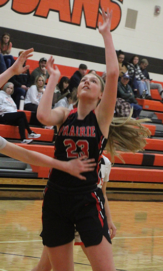 free throws while committing 11 turnovers.Logos scored their first points at the 6:30 mark of the second quarter. Prairie then scored 9 straight with Kylie Schumacher scoring 6 of those. Elven had a lay-up and Shears had a free throw. Logos doubled their score with 2 free throws at the 1:50 mark. Beka Schumacher finished off the half with a basket for a 35-4 halftime lead. Kylie Schumacher started the second half scoring with a basket and a free throw. Logos answered with a basket and a free throw of their own. Hanson then hit from just inside the 3-point line to make it 40-7. Logos scored another free throw and a basket to get to double figures. Elven, Kylie Schumacher and Shears each scored to make it 46-10. After a Logos basket, Beka Schumacher ended the third quarter with a putback to make it 48-12. In the running clock fourth quarter Logos outscored Prairie 5-8. Shears scored a lay-up and Schlader had a 3-point play for Prairie. Kylis Schumacher led the scored with 17 points. Hanson was also in double figures with 10 while Elven scored 9, Shears 8, Beka Schumacher 6 and Schlader 3. Prairie had a 35-30 edge on the boards. Shears led the team with 8 boards while Kylie Schumacher had 7. Shears and Hanson each had 4 steals while Shears and Schlader each had 3 assists. Prairie was 21 for 59 from the field, 36%, and 8 for 14 at the line, 57%. Logos was 6 for 31 from the field, 19%, and 6 for 12 at the line, 50%. Prairie won a 2-quarter JV game 38-11. Kennedy Riener, Aubree Riener and Rambo each scored a basket for a 6-0 lead. After a Logos basket, Rambo scored twice more to make it 10-2. After another Logos basket, Prairie closed the first quarter with an 8-0 run. Brannan, Hagen, Bekah Shears and Tori Shears each scored a basket as Prairie led 18-4 after 1. Rambo scored 2 baskets to open the second quarter. After a Logos 3-point play, Hagen, Tori Shears and Audrey Warren each scored to Make it 28-7. After another Logos basket, Rambo, Brannan and Kennedy Riener each scored to make it 34-9. After Logos scored their final points, Hagen and Kennedy Riener scored the final 2 baskets of the game. Rambo led the scoring with 12 points while Kennedy Riener and Hagen scored 6 each. Brannan and Tori Shears scored 4 each while Aubree Riener, Bekah Shears and Warren scored 2 each. Prairie had a 15-13 edge on the boards led by Brannan with 4. Rambo and Hagen had 5 steals each while Cash and Uhlenkott had 4 assists each. Prairie was 19 for 36 from the field, 53%, and 0 for 1 at the line. Logos was 5 for 16 from the field, 31%, and 1 for 5 at the line, 20%. Prairie 24 11 13 5 -53 Logos 0 4 8 8 -20 Prairie-Shears 3-11, 1-4, 8; Hanson 4-5, 0-0, 10; Schlader 1-3, 1-1, 3; Elven 4-9, 1-1, 9; K. Schumacher 7-16, 3-4, 17; B. Schumacher 2-8, 2-4, 6; Rowland 0-2, 0-0, 0; Brannan 0-5, 0-0, 0; Cash 0-0, 0-0, 0; A. Riener 0-0, 0-0, 0; K. Riener 0-0, 0-0, 0. 3-pointers-Hanson 2, Shears. Logos-Driskill 4-10, 3-6, 11; Covington 0-1, 0-0, 0; Wilson 0-3, 0-0, 0; Bentley 0-2, 0-0, 0; Spillman 1-8, 3-4, 5; Doane 0-0, 0-0, 0; Rench 1-6, 0-2, 2; Points 1-2, 0-0, 2. 3-pointers-none. At Troy The game at Troy started