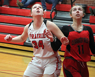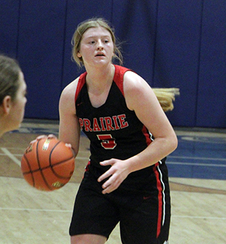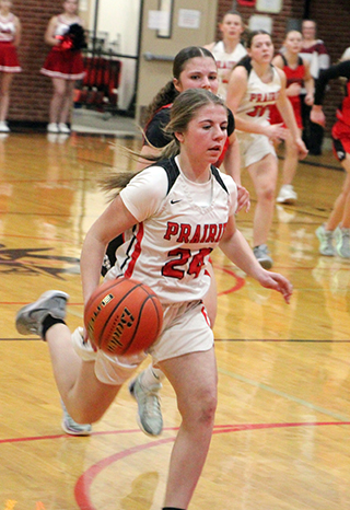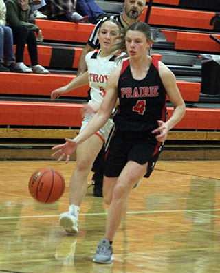 of the first quarter.Prairie opened the second quarter with a 7-0 run. Beka Schumacher scored a putback. Brannan then score after a steal and then hit a 3-pointer to make it 20-11. After a Troy basket, Prairie scored another 7 straight points. Beka Schumacher made 2 free throw. Shears then scored a free throw. Beka Schumacher scored on an inbounds play and Kylie Schumacher drove for a lay-up to make it 27-13. Troy scored a free throw which Shears answered. A Troy putback was answered with a midrange shot by Schlader. Kylie Schumacher followed with a putback and Troy ended the first half with a free throw that made it 32-17. Troy scored to open the third quarter then Prairie scored 10 straight points, all by Kylie Schumacher and most of them where she would see a turnover happening and head for the Prairie end of the court for a lay-up. Each team ended the quarter with a basket and a free throw with Prairie’s scored by Beka Schumacher. Shears opened the fourth quarter with a 3-pointer. Two baskets by Beka Schumacher put Prairie up 52-21 and invoked the running clock mercy rule for the final 6:14. Rowland scored a basket to make it 54-21. Troy scored their final points with 4:30 left and Lillian Rehder added a perimeter shot for the final points of the game. Kylie Schumacher scored 20 to lead all scorers. Beka Schumacher added 15 points. Shears and Brannan scored 5 each with Schlader scoring 4, Elven 3 and Rowland and Rehder 2 each. Prairie had a 38-27 advantage on the boards led by Elven who had 13. Shears had 7 steals and 4 assists to lead both categories. Prairie was 23 for 59 from the field, 39%, and 8 for 11 at the line, 73%. Troy was 9 for 30 from the field, 30%, and 4 for 15 at the line, 27%. Prairie is now 11-1 in league play and 15-4 overall. There was no JV game. Prairie 13 19 13 11 -56 Troy 11 6 4 2 -23 Prairie-Shears 1-6, 2-4, 5; Hanson 0-2, 0-0, 0; Schlader 2-8, 0-0, 4; Elven 1-4, 1-2, 3; K. Schumacher 9-13, 2-2, 20; B. Schumacher 6-20, 3-4, 15; Brannan 2-3, 0-0, 5; Rowland 1-1, 0-0, 2; Rehder 1-1, 0-0, 2; Cash 0-1, 0-0, 0; Behler 0-0, 0-0, 0; K. Riener 0-0, 0-0, 0; A. Riener 0-0, 0-0, 0. 3-pointers-Shears, Brannan. Troy-Webb 2-4, 0-0, 4; Chamberlin 0-3, 2-6, 2; Stoner 3-10, 1-2, 7; Moser 0-1, 0-0, 0; E. Wilson 1-6, 0-2, 3; B. Wilson 1-1, 0-0, 2; Abbott 2-3, 0-1, 4; Rodgers 0-1, 1-2, 1; Harris 0-0, 0-0, 0; Blazzard 0-1, 0-2, 0; Ward 0-0, 0-0, 0. 3-pointers-E. Wilson ![]() Faith Cash drives for a lay-up after a steal against C.V. Also shown are Reagan Brannan and Sydney Shears. ![]() Kylie Schumacher looks to rebound against C.V. ![]() Hailey Hanson handles the ball at Logos. ![]() Reagan Brannan goes for a lay-up at Logos. ![]() Sydney Shears with the ball in the paint at Logos. ![]() Beka Schumacher goes for a lay-up at Troy. ![]() Eric Schlader pulls up for a shot at Troy. ![]() Sydney Shears brings the ball upcourt at Troy. PIRATES GIRLS BASKETBALL SCHEDULE FOR 2025-26