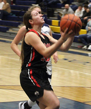 Kylie Schumacher and Sydney Shears each scoring a basket. C.V.