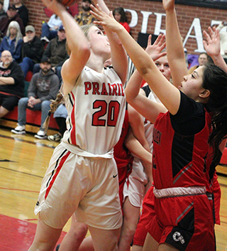 Lexi Schumacher made a free throw, Sydney Shears scored on a drive and Sage Elven scored twice to make it 9-0.C.V. got on the board with 2 free throws at the 5:28 mark. Kylie and Lexi Schumacher each scored to make it 13-2. C.V. then got their first basket on a 3-pointer. That was followed by a basket by Shears, 2 free throws by Lexi Schumacher and a lay-up by Elven to make it 19-5. The Rams then scored their first 2-point basket but Prairie came back with a 10-0 run. Hailey Hanson hit a 3 to start it. Ellie Nuxoll made a free throw then Lexi Schumacher scored 3 straight baskets off of C.V. turnovers, 2 of them steals by Lexi. That made it 29-7. After another C.V. basket, Lexi closed out the first quarter with a 3-pointer and a lay-up to make it 34-9. C.V. scored to open the second quarter and Kylie Schumacher answered with a lay-up. After another C.V. basket, Nadia Cash and Elven each scored and Lexi Schumacher added a free throw to make it 41-13. After a C.V. free throw, a steal by Kylie Schumacher led to a lay-up by Lexi Schumacher. The Rams then scored a basket and a free throw before Erica Schlader got in the scoring column with a lay-up. After another C.V. basket, Aubree Rehder closed out the first half scoring with a bank shot at the buzzer. The third quarter was nearly a duplicate of the first quarter as Prairie outscored C.V. 35-7 to take an 82-26 lead into the fourth quarter. In the first quarter Lexi Schumacher scored 16 of Prairie’s 34 points. In the third quarter 6 different players scored at least 4 points. Lexi had 4 baskets including a 3 for 9 points. Elven and Kylie Schumacher each had 3 baskets for 6 points. Nuxoll had 2 baskets and 2 free throws for 6 points. Finally Sydney Shears had 2 baskets and Mia Anderson had a basket and 2 free throws for 4 points each. The fourth quarter was played with a running clock and Prairie outscored the Rams 10-2. Rehder scored 5 on 2 baskets and a free throw. Nuxoll scored a basket and a free throw and Schlader added a basket. Lexi Schumacher wound up with 28 points to lead the scoring. Elven with 14, Kylie Schumacher with 12 and Nuxoll with 10 were also in double figures. Shears scored 8, Rehder 7, Anderson and Schlader 4 each and Hanson 3. Prairie had a 44-33 advantage on the boards led by Kylie Schumacher with 9 and Elven with 8. 9 different plays had at least 2 steals led by Shears and Kylie Schumacher with 7 each. Nuxoll, Rehder and Lexi Schumacher had 5 steals each. Lexi and Kylie Schumacher each had 5 assists while Hanson and Shears had 4 assists each. Prairie was 38 for 78 from the field, 49%, and 11 for 18 at the line, 61%. C.V. was 11 for 42 from the field, 26%, and 5 for 12 at the line, 42%. Prairie won the 2-quarter JV game 34-7. Prairie jumped out to a 10-0 lead with Mia Anderson scoring 2 baskets while Zoey Behler, Reagan Brannan and Beka Schumacher scored a basket each. C.V. got on the scoreboard at the 3:14 mark. Anderson followed with a pair of baskets to make it 14-2. After a C.V. free throws, Erica Schlader scored the final 5 points of the quarter on 2 baskets and a free throw. Prairie then scored the first 15 points of the second quarter for a 34-3 lead. Beka Schumacher started the run with a lay-up then Schlader scored 2 baskets and a 3. Faith Cash scored 2 baskets and Kenly Forsmann finished off Prairie’s scoring with a steal that led to a lay-up. C.V. then scored a free throw and a 3 to close out the game. Schlader scored 12 points to lead Prairie with Anderson scoring 8, Schumacher and Cash 4 each and Brannan, Behler and Forsmann 2 each. Prairie controlled the boards 29-12 with Brannan grabbing 8 to lead the team. Schlader had 7 steals while Brannan had 5 steals and 3 assists. Prairie was 16 for 48 from the field, 33%, and 1 for 5 at the line, 20%. C.V. was 2 for 6 from the field, 33%, and 2 for 5 at the line, 40%. Prairie 34 23 35 10 -92 C.V. 9 10 7 2 -28 Prairie-L. Schumacher 11-19, 4-7, 28; Shears 4-8, 0-0, 8; Hanson 1-2, 0-0, 3; Elven 7-10, 0-0, 14; K. Schumacher 6-8, 0-0, 12; Cash 1-2, 0-0, 2; Nuxoll 3-6, 4-6, 10; Rehder 3-11, 1-2, 7; Anderson 1-6, 2-2, 4; Kalmbach 0-4, 0-0, 0; Schlader 2-2, 0-1, 4. 3-pointers-L. Schumacher 2, Hanson. C.V.-Pfefferkorn 3-8, 2-4, 8; Martinez 2-8, 0-0, 4; E. Lundgren 2-10, 0-2, 4; Reuben 1-6, 1-2, 4; T. Lundgren 0-2, 2-2, 2; Logan 1-3, 0-2, 2; Wellard 0-0, 0-0, 0; Shira 1-2, 0-0, 2; Ward 1-3, 0-0, 2; Davis 0-0, 0-0, 0. 3-pointers-Reuben. At Troy The game at Troy was nearly as lopsided as the C.V. game Prairie