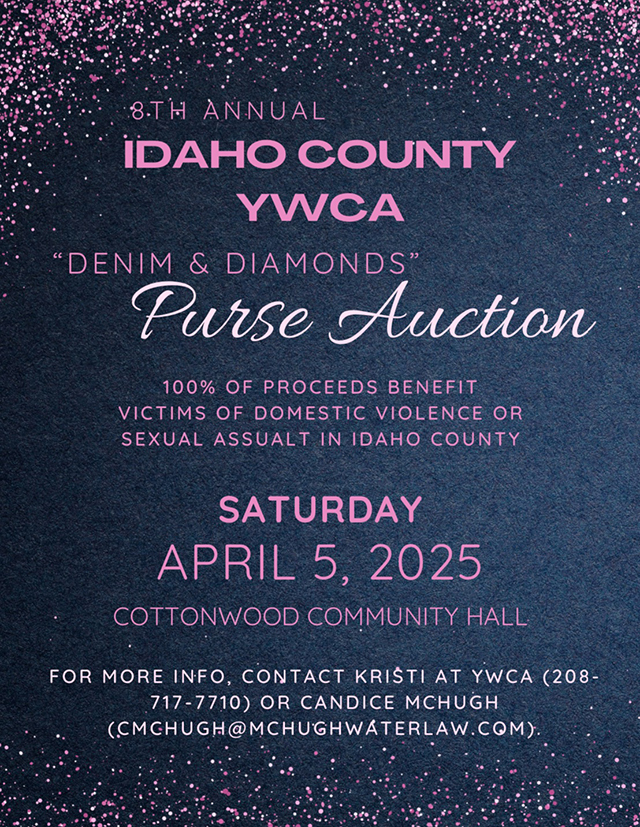 The 8th Annual YWCA Idaho County Purse Auction will be held April 5, 2025, at the Cottonwood Community Hall. Doors open at 5:00 and there will be a silent auction, dessert auction, live auction along with a pasta bar and bar to purchase wine and beer. The Purse Auction began 9 years ago when Debbie and Ron Schnider met Kristi Kientz and wanted to help victims of domestic violence and sexual assault in Idaho County. The event has grown and this year, it is being held on a Saturday evening, with a theme of “Denim and Diamonds” – there will be items that are suited to both men and women and you can dress up for a night out or come casual; it’s all for a great cause! Tickets are available in advance for $20 which includes dinner or $5 for admission only. Tickets are available on the day of the event as well for an additional $5 each. The funds raised provide temporary housing, household necessities, workbooks for the classes, transportation, gas cards, clothing, court appearances and bus tickets for victims. The YWCA also provides counseling and job seeking assistance. 100% of the proceeds stay in Idaho County and portions of Lewis County served by the Grangeville office. The goal is to eventually build or acquire a safehouse for victims. If you need additional information you can visit the YWCA Purse Auction Facebook event page at https://www.facebook.com/events/9197600230323430/permalink/9203393633077423/ or search 2025 Idaho County YWCA Purse Auction on Facebook. ![]() |