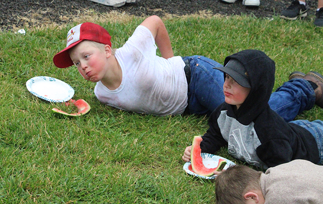 Greencreek Celebration in pictures ![]() Some of the breakfast crowd inside the hall. ![]() Adam Frosmann again ran the bingo with lots of help from some young callers. ![]() A canopy was set up for the auctioneers and we're sure they appreciated it as the heaviest rain of the day came as the auction started. From left are Don Schumacher, auctioneer John Schumacher and Aaron Hinkelman. ![]() Youngsters enjoy the bouncy castle. ![]() The barrel train is always popular with the youngsters. When Dale Stubbers first fired up the lawn tractor that pulls it there was a rush of youngsters over to be the first to get a ride. ![]() The always popular kiddie-car merry go round that has to be close to 60 years and running. ![]() The little merry go round was popular with the little tykes. ![]() A couple of youngsters try out the sumo suits. The fight was over once one of them fell down as they were like a turtle on their back and needed help to get back up again. ![]() Street sports started in a light sprinkle with the youngest runners starting things. ![]() The second youngest group of racers near the finish line. ![]() The over 25 foot race. They had to go down to the finish line and then turn and go back to the start. ![]() The young ladies at left appeared about to finish first when they crashed in the 3-legged race. ![]() The start of the wheelbarrow race. ![]() The youngster in the red hoodie at front unfortunately had his egg break on the very first toss. ![]() This young man let out a scream as his egg broke when he caught it. ![]() This young lady's egg exploded on her. ![]() The young man in the white t-shirt comes up for air after finishing off his chunk of watermelon in the watermelon eating contest. ![]() The middle group in the watermelon eating contest. Madison Duman, in the blue print shirt wound up winning. ![]() A pair of previous winners go it at as Sebastian Nuxoll and his father Eric near the finish. Eric, a multi-year winner, came out on top again. |