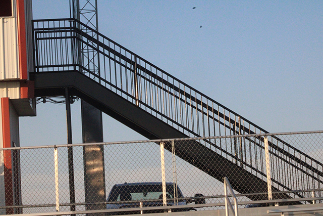 Fabrication, lower photo, built new stairs for the announcer booth at