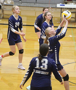 Lady Patriots win at Highland The St. John Bosco Lady Patriots picked up a league win at Highland Monday, Sept. 22 by set scores of 25-18, 16-25, 25-23, 25-20. ![]() Highland scored the first point then missed a serve. Miah Mager then served 6 straight for a 7-1 lead as Savannah Perrin scored 5 straight kills before Mager served an ace to make it 7-1. 5 of the next 6 points were sideouts with a kill by Madeline Wassmuth being the only point scored while serving. Catherine Beckman scored a kill to make it 11-5 then Catherine Seubert served an ace for a 12-5 lead. After 2 sideouts, Beckman served an ace to make it 14-6. Highland scored later on to cut the lead to 17-10 but on that played Perrin rolled her ankle and had to be helped off the floor. The Patriots were able to build a 23-13 lead but then saw Highland score 4 straight before Cece Remacle score a kill to get to set point at 24-17. A net violation gave Highland back the serve but a hitting error by the Huskies gave St. John Bosco the win. In the second set the Patriots had to shuffle their lineup as they moved Seubert to Perrin’s middle blocker position and put Maggie Black into Seubert’s usual spot. The Patriots were able to take early 4-3 and 5-4 leads. Highland scored 3 straight to take a 5-7 lead but Bosco fought back and led 11-9 after 2 aces by Wassmuth. At 12-10 Highland scored a sideout and added 5 more points to take a 12-16 lead. The Patriots were unable to get any closer than 2 at 14-16, the rest of the set as Highland evened the match at 1 set each. After getting her ankle taped and trying to walk off the injury, Perrin was able to return to the lineup for the third set. Highland took the early lead but a kill by Wassmuth tied it at 4-4 and Perrin then served 4 straight, 3 of them aces, for an 8-4 lead. Highland answered with 5 straight to retake the lead and after Wassmuth scored a kill to tie it at 9, Highland scored a sideout and built a 12-16 lead. A kill by Perrin ended their run and Mager then served the Patriots back into the lead. 3 straight kills by Perrin and an ace by Mager made it 17-16. Highland again answered and took back the lead. The Patriots tied it at 19 and 20 but each time Highland answered. A bad serve by Highland tied it at 21 and Seubert then served an ace to put the Patriots on top. Highland scored 2 straight but Mager scored a kill to tie it at 23 and Beckman then served 2 aces to give the Patriots the set and a 2 sets to 1 lead. In the fourth set Highland bricked the opening serve and Remacle then served 2 aces for a 3-0 lead. After a sideout put Highland on the board, Perrin scored a sideout kill and Mager served 2 aces for a 6-1 lead. Highland scored another sideout but a kill by Perrin sent her to the service line for 4 straight and an 11-2 lead. Remacle, Seubert, Beckman and Wassmuth each scored a kill in that run. Highland then scored 9 of the next 10 points to cut their deficit to 12-11. A back row kill by Mager and a kill by Beckman made it 14-11. The lead stayed between 2 and 3 points until Highland scored to pull within 1 at 19-18. Beckman and Seubert each scored a kill to push the lead back to 3 at 21-18. At 22-20, Seubert scored a kill on a bump and Beckman then served out the match. She served an ace to get to match point and Perrin then scored the match-winning kill. Despite missing more than a set of play, Perrin wound up lading the team in kills with 18 and added 5 aces. Seubert had 9 kill and 4 aces. Wassmuth had 7 kills, 13 assists and 2 aces. Remacle had 4 kills, 24 assists and 3 aces. Mager had 4 kills, 2 assist and 6 aces. Beckman had 4 kills, 2 assists and 4 aces. Black had 2 kills and 1 ace. With the win the Patriots improve to 2-6 overall and 2-5 in league play. The JV teams split their two games 25-22, 18-25. The Patriots took a 7-4 lead on an ace by Anna Mae Cummings. Highland then responded with 4 straight to take the lead. Highland led 9-14 when they missed a serve Wassmuth then served 3 straight including 2 aces to cut the lead to 13-14. Bosco was able to tie the game at 16, 19, 20 and 21 but each time Highland would retake the lead. Finally Highland bricked a serve to make it 22-22 and Wassmuth then served out the set. Beckman scored a kill, Wassmuth served an ace and Cummings then scored the set winning kill. In the second set Bosco led 6-4 after 2 aces by Beckman but then Highland scored 5 straight points to take the lead. Bosco got within 1 on an ace by Cummings but Highland then scored 4 straight to take a 5 points lead at 8-13. Bosco was unable to get any closer than 2 at 12-14 the rest of the way. Their final push got them within 2 at 18-21 after an ace by Beckman but Highland then scored a sideout and served out the set. Due to limited numbers for the Patriots they did not play a tie-breaking set. ![]() Catherine Seubert spikes the ball against Highland. ![]() Cece Remacle passes the ball. Also shown are Catherine Seubert and Miah Mager. ![]() Madeline Wassmuth sets the ball at Highland. Also shown are Catherine Seubert, Cece Remacle, Miah Mager and Catherine Beckman. ![]() Miah Mager passes the ball. Also shown is Madeline Wassmuth. ![]() Savannah Perrin goes for a spike at Highland. Also shown are Catherine Seubert and Madeline Wassmuth.