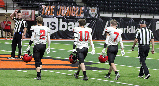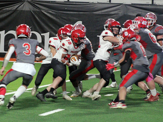 Defensively, the Pirates held the Grizzlies running game in check but struggled with the Grizzlies passing game. Grace received the opening kickoff and needed 10 plays to go 62 yards for the opening touchdown. That came on a 19 yard pass from quarterback Gavin Draper to running back Bryant Moss. Prairie wasn’t able to move the ball on their first possession and were hurt by a false start penalty. They punted and Grace took over at their own 39. The Pirates’ defense gave up a first down and then had Grace facing fourth and 7 at the Prairie 44. They went for it and Draper found Kade Kimball wide open for a 44 yard touchdown. They added a 2-point run for a 0-14 lead. Prairie picked up a first down on their next possession as Levi Gehring picked up 2 yards on third and 1. However that possession ended when Grace intercepted Kade Quintal’s pass at the Prairie 45 on the first play of the second quarter. They returned the ball 18 yards to the Prairie 27. Three plays later Grace scored again, this time on a 3 yard run. Lane Mader’s tackle stopped the 2-point play as Grace now led 0-20. Prairie had to punt again after facing and fourth and 20. Grace took over at their own 29. What followed was a bizarre possession where a penalty was called on 5 consecutive plays. 3 of those were on Grace which backed them up to their own 5 where they had a first and 34. Prairie then got flagged twice which moved the ball back out to the 25. Grace then had 2 incomplete passes and an 8 yard run that set up fourth and 6 from the 33. Grace decided to go for it and were stopped 1 yard short by the defense. Prairie took over at the Grace 38 and put together their first scoring drive. After an incomplete pass, Quintal picked up a first down on a 10 yard run. On second and 5 from the 23, Quintal passed down the left side to Cooper Riener for 20 yards to set up first and goal at the 3 yard line. Prairie tried running the ball 3 straight times setting up fourth and goal just inches from the goal line. Chris Schumacher was able to dive across the goal line on fourth down to put the Pirates on the scoreboard. Quintal passed to Gehring for the 2-pointer to make it 8-20. Grace answered right back with a 2-play 59 yard scoring drive. The touchdown came on a 48 yards pass from Draper to Parker Yost, their 6’5” tight end. Grace kicked the extra point to make it 8-27. Grace tried an onside kick with Payton Stamper recovering at the Prairie 47. Prairie picked up a couple of first downs as Quintal passed to Gehring for 9 yards to convert a second and 6. Schumacher then picked up 6 yards and Quintal passed to Levi McElroy for 7 yards for another first down at the Grace 27. Quintal picked up 4 yards on first down and after an incomplete pass, Grace was called for encroachment to set up third and 1. Prairie was unable to convert and turned the ball over on downs at the 18. Grace went for it again on fourth and 10 from their own 18. Schumacher batted the pass away and Prairie took over on downs with just seconds left in the half. Gehring was unable to gather in Quintal’s hail mary pass into the end zone as the half ended. Grace kicked off to start the second half and tried an onside kick. The ball only went 3 yards and Prairie took over on the Grace 43. The Pirates were unable to move the ball and turned it over on downs after gaining just 1 yard. Grace took over and picked up 4 first downs. The last set up first and goal at the 10. A holding penalty followed by a sack for a 6 yard loss by Trajan Elven set Grace back to the 26. They managed to get the ball down to the 12 before their fourth down pass was dropped. Prairie took over at the 12 and picked up a first down on a 10 yard pass to Riener. A third down sack for a loss of 7 led to a punt. Grace took over at the Prairie 44 and needed just 3 plays to score. Carter Kimball caught a 26 yard pass for the touchdown and Bradley Schiele kicked the extra point for an 8-34 lead. Prairie took over after a 19 yard kickoff return by Isaiah Warren at their own 32. Gehring caught a pass for 13 yards and then ran for 15 to move the ball to the Grace 40. Grace