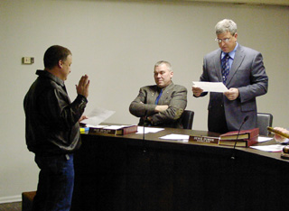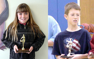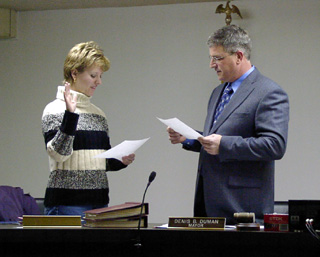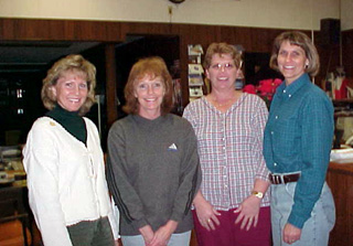 The new Cottonwood City Council and Mayor took over Monday at the January meeting. In the top photo new mayor Denis Duman swears in Jack Duman as council member and in the lower photo the mayor swears in Shelli Schumacher who was appointed to fill the vacant position. This months attendance winners at Prairie Elementary are first graders Kellie Heitman and Dally Ratcliff. They get to eat lunch with principal Rene' Forsmann. Prairie Booster Club elected officers for the 2003-04 year. From left are Linda Nida, secretary; Chris Kaschmitter, president; Marie Lerandeau, treasurer and Cheri Holthaus, vice-president. Two Cottonwood students won the district hoop shoot at Grangeville Saturday. Left is Megan Sigler of Prairie Elementary who won the 8-9 yr. old girls competition and right is Beau Schlader of Summit Academy, who won the 10-11 yr. old boys competition. Both will compete at Lewiston this weekend. |