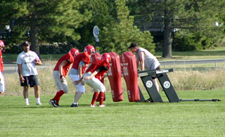 first game which is Friday, Sept. 2 at Troy. Shown here is a blocking drill.