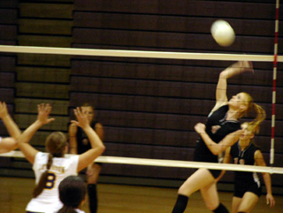 at a jamboree at Lewiston. Natalie Arnzen spikes the ball. |