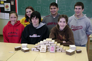 Students at Prairie High are making personalized card boxes for our troops. They are still in need of names and branch of service so they can laser etch the names. Left to right, front row, Cassandra Schaeffer, Alex Flatt, and Joe Trock, back row is Jallisa Wright, Mason Fry, and Kelby Wilson. Mason Fry has been working on the laser and scanner, Kelby Wilson designed the box and is the head gluer/ assembler, The rest of the students share duties of sanding, gluing, buffing. The 4th hour class has been helping as well so that we get the boxes done to mail out as soon a possible. They are all doing a great job. The lower picture shows a closeup of the card boxes.