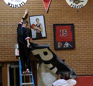 The Prairie boys basketball team lost twice in the Prairie Classic Tournament, falling 46-56 on Friday, Dec. 17, to Council and 30-38 on Saturday to Kamiah. A bigger loss than the games though was losing Chad Arnzen to injury. He re-injured the knee that caused him to miss most of his sophomore season in Friday’s game against Council and was on crutches for Saturday’s game. No word at this writing on the extent of the injury. Prior to the game the basketball and baseball teams honored Jacob Riener in a ceremony. A shadowbox with Jacob’s baseball jersey and the large portrait of him from last were unveiled on the south wall of the gym, which will hang there until the end of what would have been his senior year then they will be given to the family. Also in Riener’s memory, his best friend, Mat Forsmann, wore Riener’s #24 basketball jersey during the game. Forsmann was to see his first action since spraining his ankle a couple days prior to the team’s season opener. The game with Council was a tough battle until the end of the third quarter as neither team could build much of a lead until that point. Council plays an aggressive brand of basketball with full-court pressure for the entire 32 minutes and once the get the ball it’s full speed ahead. Their style of play results in a lot of turnovers for both teams. Prairie fell behind at the start as Council scored the game’s first 5 points but the Pirates answered bask as Corey Schaeffer connected on a pair of shots. With 2:40 left in the quarter Prairie trailed 5-9 then Arnzen took over. He scored a putback then converted a 3-point play with his free throw giving Prairie their first lead at 10-9. After a Council basket Arnzen scored a lay-up to make it 12-11 at the quarter break. The scoring went back and forth in the second quarter until the 3 minute mark. With 3:02 left in the half Arnzen scored a lay-up for a 21-19 Prairie lead. Council then went on a 1-7 run to take the lead and they led 25-27 at the half. Council broke the tie with a 3-pointer and that launched them on a 2-14 run that put them in control at 35-47. Prairie answered back with an 8-0 run of their own to close within 4 points at 43-47 with 2:24 left. Council broke the run with a basket with 2:07 left. It was 20 seconds after that that Arnzen got hurt and that seemed to take the steam out of the Pirates as Council scored 7 more points until Forsmann’s 3-pointer with 6 seconds left that ended the game’s scoring. Arnzen wound up as Prairie’s leading scorer and rebounder with 18 points and 13 boards. Schaeffer was a perfect 7 for 7 from the field for 14 points. Forsmann and Crane scored 5 each. Kelby Wilson scored 3 and Kevin Funke scored 1. Prairie held a 41-27 rebounding advantage with Crane and Funke pulling down 8 rebounds each and Schaeffer 7 in addition to Arnzen’s 13. Forsmann had 7 steals and 2 assists while Crane had 3 assists and Funke had 2 Prairie was 20 for 50 from the field, 40%, and 5 for 21 at the line. Council was 21 for 48 from the field, 44%, and 8 for 13 at the line. In Saturday’s game against Kamiah, Prairie jumped out to a 4-0 lead as Forsmann scored a pair of free throws and a putback. After a Kamiah basket Prairie pushed the lead to 9-2 on a lay-up by Sean Daly and a high-arcing 3-pointer by Funke. Kamiah cut the lead to 9-7 but lay-ups by Chris Schumacher and Crane gave Prairie a 13-7 lead at the quarter break. With 3:50 left in the second quarter Prairie led 18-13 but then didn’t score another point in the half. Kamiah connected on a 3-pointer and a putback to tie the score at 18 at halftime. The Kubs took their first lead in the third quarter and had a 20-24 lead with 5:06 left in the quarter. 2 free throws and a driving lay-up by Forsmann tied the score at 24 but a 3-point bomb by Kamiah gave the Kubs a 24-27 lead heading into the fourth quarter. A basket by Forsmann and a pair of baskets by Crane gave Prairie a 30-29 lead with 4:50 to play. That was it for the Pirates who hit another long dry spell with the Kubs scoring the game’s final 9 points. Forsmann had 12 points to lead the Pirates in scoring with Crane scoring 8, Daly 4, Funke 3, Schumacher 2 and Schaeffer 1. Prairie had a 37-34 rebounding edge led by Schaeffer who had 13. Crane added 7 rebounds and Forsmann had 6. Schaeffer had 3 steals and Daly and Funke had 2 assists each. Prairie was 12 for 38 from the field, 32%, and 5 for 8 at the line while Kamiah was 17 for 56 from the field, 30%, and 0 for 6 at the line. Schaeffer was named to the all-tournament team as selected by the 4 team’s coaches. With the losses Prairie drops to 1-5 on the season. Vs. Council Council 11 16 12 17 -56 Prairie 12 13 10 11 -46 Prairie-Crane 2-9, 1-2, 5; Funke 0-1, 1-5, 1; Forsmann 2-16, 0-2, 5; Schaeffer 7-7, 0-3, 14; Arnzen 8-12, 2-5, 18; Wilson 1-4, 1-2, 3; S. Daly 0-1, 0-0, 0; Holthaus 0-0, 0-0, 0; Schumacher 0-0, 0-0, 0; R. Daly 0-0, 0-0, 0. 3-pointers-Forsmann. Council-C. Green 1-7, 1-2, 4; Schuck 3-5, 2-2, 10; McConnell 5-8, 0-0, 13; Day 7-11, 2-5, 16; Chadwell 4-11, 1-2, 9; Edmunson 0-2, 2-2, 2; J. Green 1-3, 0-0, 2; Paradis 0-1, 0-0, 0. 3-pointers-McConnell 3, Schuck 2, C. Green. Vs. Kamiah Kamiah 7 11 9 11 -38 Prairie 13 5 6 6 -30 Prairie-Crane 4-11, 0-0, 8; Schaeffer 0-2, 1-2, 1; Funke 1-2, 0-2, 3; Forsmann 4-13, 4-4, 12; Wilson 0-2, 0-0, 0; S. Daly 2-6, 0-0, 4; Schumacher 1-2, 0-0, 2; Holthaus 0-0, 0-0, 0. 3-pointers-none. Kamiah-L. Harding 1-5, 0-0, 2; LaPrairie 2-10, 0-1, 6; Hagen 2-9, 0-1, 4; J. Harding 4-16, 0-2, 9; Uhlorn 2-3, 0-2, 4; Breshears 4-9, 0-0, 8; Whittle 0-2, 0-0, 0; Schlader 2-2, 0-0, 5. 3-pointers-LaPrairie 2, J. Harding, Schlader. Prior to the game Friday night a ceremony was held honoring Jacob Riener who died of cancer in September. Mat Forsmann has just finished peeling away the covering to show Jake's picture from last year and a shodow box with his varsity letter and baseball jersey. They will hang in the Prairie gym until the end of what would hav