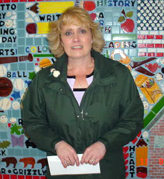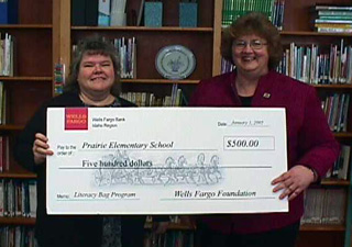 $500 grant check from the bank to Cindy Schumacher of Prairie Elementary