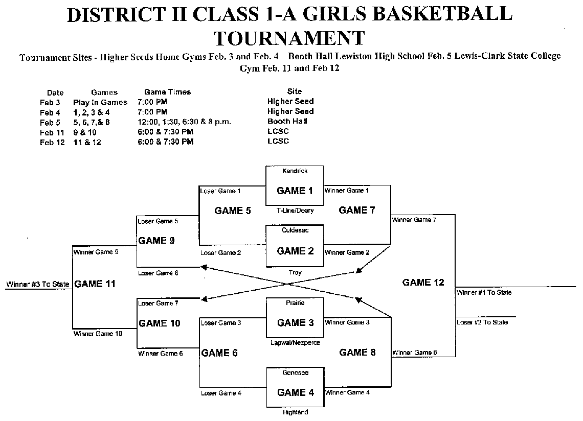 The Prairie Lady Pirates finished the regular season as champions of the South Pod of the White Pine League and will host a first round game of the District Tournament this Friday, Feb. 4 at 7 p.m. at the PHS gym. No passes, other than IHSAA passes will be accepted at the gate. They will play the winner of the play-in game between Nezperce and Lapwai. Win or lose, Prairie will play Saturday at Booth Hall in Lewiston. They will play at 8 p.m. if they win and at 1:30 p.m. if they lose. They will play either Highland or Genesee in the second round. The reason the seedings don’t match the standings you may have seen in the Lewiston paper is that they just used the games within the pods for seeding purposes. So Prairie’s 8-0 record against other South Pod teams was used rather than their 10-3 record against all White Pine League teams. This led to Troy, Genesee and Lapwai all tying for second in the North Pod leading to a drawing for positions with Genesee getting 2nd seed, Troy 3rd and Lapwai 4th. Similarly Highland and Culdesac tied for second and split their games leading to a coin flip with Culdesac getting the 2nd seed and Highland 3rd. The tournament will continue on Friday and Saturday, Feb. 11 and 12. On the 11th will be two loser-out games. The winners of those two games will play at 6 p.m. on Saturday for third place with the championship game at 7:30 p.m. All games on the 11th and 12th will be at the new LCSC Activity Center. Left click your mouse on the above bracket to go to a much larger, more readable version of the bracket. |