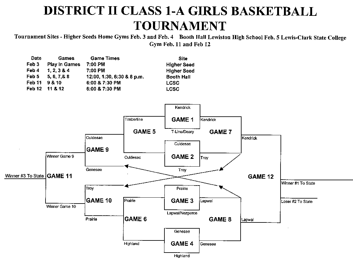 The Prairie Lady Pirates continue in District action this Friday, Feb. 11 at approximately 7:30 p.m. against Troy in a loser-out contest. The game will be held in the new LCSC Activity Center. If Prairie wins that game they will play again at 6 p.m. Saturday, Feb. 12, also at LCSC, against the Genesee-Culdesac winner for a trip to state. Kendrick and Lapwai have already clinched trips to state and will play for the District Championship at 7:30 p.m. Saturday. Boys District to start Feb. 17 The District II Class 1-A boys basketball tournament is set to start Thursday, Feb. 17 with a pair of play-in games. It looks at this point like Prairie will have the opportunity to host a first round game as the #2 seed from the South Pod of the White Pine League. If that’s the case their likely opponent would be Genesee, currently third in the North Pod behind Lapwai and Troy. The tournament continues on Monday, Feb. 21 at the new LCSC Activity Center with 4 games scheduled for noon, 1:30, 6:30 and 8 p.m. The tournament then takes a break until Friday, Feb. 25 when a pair of loser-out games will be played. On Saturday, Feb. 26 the tournament concludes with the third place and championship games. Game times on Feb. 25-26 are 6 and 7:30 p.m.