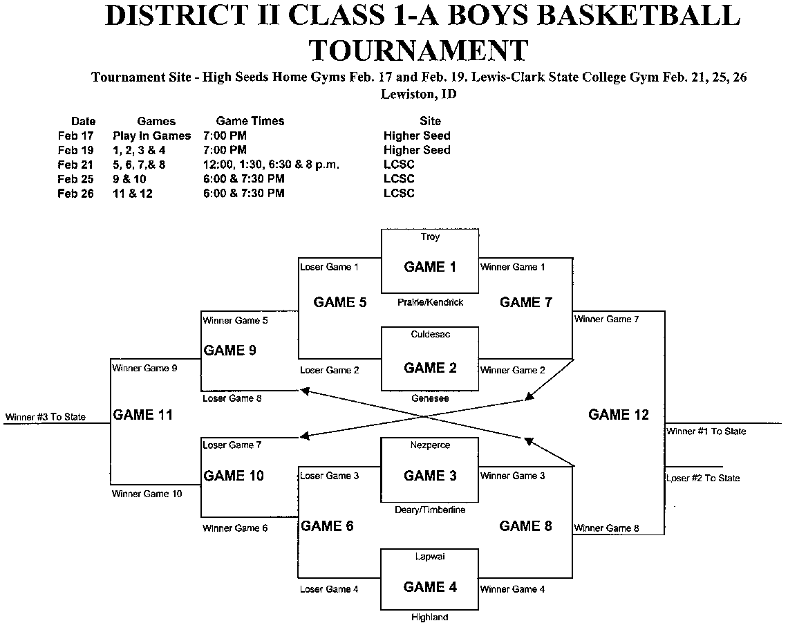 With the losses to Culdesac and Highland last week the Prairie Pirates finished in fourth place in the South Pod standings and will host Kendrick Thursday, Feb. 17, at 7 p.m. in a District Tournament play-in game. The winner of that game will travel to either Troy or Lapwai, depending on who wins their game Tuesday, on Saturday, Feb. 19 at 7 p.m. for a first round game in the bracketed portion of the District Tournament. The winner on Saturday will play the winner of the Culdesac-Genesee game at 6:30 p.m. on Monday, Feb. 21 at the LCSC Activity Center. The loser on Saturday will play at noon on Monday against the Culdesac-Genesee loser. The tournament will continue on Friday, Feb. 25 with a pair of loser out contests and on Saturday, Feb. 26 with the third place and championship games. The second weekend’s games are at 6 and 7:30 p.m. and are at the LCSC Activity Center. Three teams will advance to state.