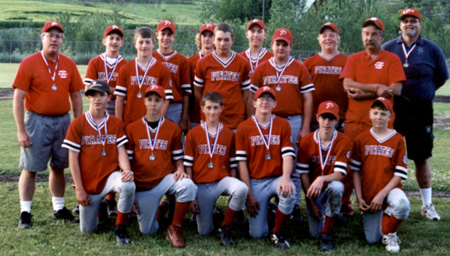 The Prairie Pirate Babe Ruth team ended its regular season on June 18th with a second place finish at the Central Idaho League tournament. They lost in the championship game to Grangeville 6-4. For the year, the Pirate team had an official record of 11-5, which included 5 games against Moscow and Lewiston Babe Ruth teams. Awards received by the Pirate players at the league tournament included home run pins to Devin Schmidt, Ronnie Chandler, and Eric Daly. David Sigler was named the league batting champion. Taylor Rieman garnished the team’s Sportsmanship Award. Nita Chandler was named “Team Mom”. 13 year old All-Star selections from the Prairie team were Kyle Holthaus, Dylan Prigge, Conner Rieman, and David Sigler. 14 year olds named to the All-Star team include Ronnie Chandler, Eric Daly, Kyle Daly, Michael Matson and Joe Schumacher. The Central Idaho League All-Stars will compete in the District Babe Ruth Tournament in Moscow, from July 15th to July 16th. The 2005 Prairie Babe Ruth team. Standing from left are Manager Kevin Daly, Michael Hattrup, Kyle Holthaus, Dylan Prigge, David Sigler, Conner Rieman, Devin Schmidt, Joe Schumacher, Ronnie Chandler, coach Sandy Wainio and coach Arnie Chandler. Kneeling from left are Michael Matson, Kyle Daly, Derek Schaeffer, Taylor Rieman, Eric Daly and Steven Baerlocher. |
