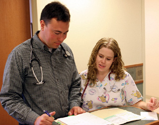 Dr. Timothy Cox and Lynn Cassill, RN, check the day's