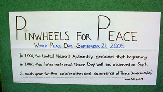 well it says: Pinwheels for Peace. World Peace Day September 21, 2005.