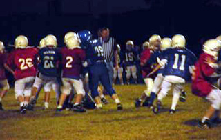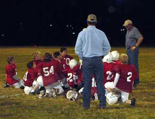PeeWee Football has started. The top photo shows action from their first game, which they won 14-12. The bottom photo shows the coaches with the players.
