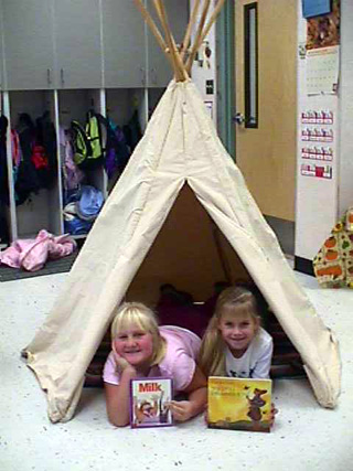the line and sitting at the table are Mrs. Schumacher's first graders.