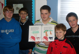 Prairie Middle School 7th grade English class and 8th grade art class worked together, along with their teachers Ms. Duman and Mrs. Lundmark, to write stories and illustrations to go with the stories for Uganda children in refugee camps. These great works of writings and art were bound and laminated and will be sent to Uganda. Writers and Illustrators: Kayla Johnson, Francesca Johnson, Wyatt Williams, Eli Rad and Kendra Ross Writers and Illustrators: James Hager Kyle Bruegeman, Joe Schumacher, Brock Heath and Garrett Workman. Writers and Illustrators: Christina Johnson, Mitchel Jungert, Katy Lowe and Taylor Ratcliff |