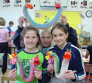 5th grade art students made art projects with a Chinese theme for the Chinese New Year. Shane Stubbers, Levi Lustig, Austin Kreautler, Matthew Jungert, and Marcus Higgins with Chinese Dragons. Karissa Terharr, Kendall Schumacher, Martina Everson, Claire Whitley, and Erika Pepper show their Chinese dragons from Art Class. Kody Duclos, Martina Everson, and Kelsey Tidwell with art projects for Chinese New Year. Pictured above are Hope Vanator, Karissa Terhaar, and Nichole Dvorak with their Chinese dragons. |