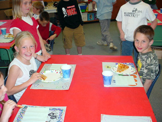 Here Talyss and Dean enjoy pizza while the 3rd/4th graders from Mrs. Schu's