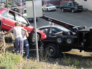 cars separated and moved. The Fred’s Body Shop tow truck lifted the front