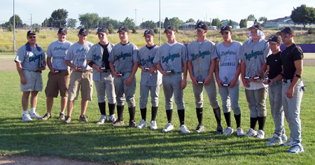 The Camas Prairie Zephyrs after receiving their second place medals at the state Senior Babe Ruth Tournament. From left to right: Manager Rick Peterson, Coach Kelby Heartburg, Coach Ryan Peterson, Stephen Key, Wade Peterson, Jason Seloske, Doug Cole, Phil Henry, CJ Rieman, Glen Caldwell, Brayden Healey and Gene Fogleman. Photo provided by Kim Peterson.