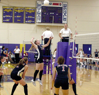 Kylie Uhlorn goes up for a spike as Brooke Holthaus,