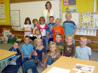 group of Kindergartners with their new teacher, Mrs. Katie Gilbert.