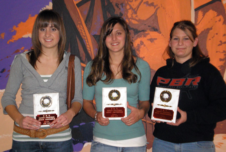 Awards were given for the Prairie volleyball team last Thursday evening. From left are Randi Schumacher, Most Valuable; Nicole Nida, Most Improved; and Shandrie Poxleitner, Most Inspirational.