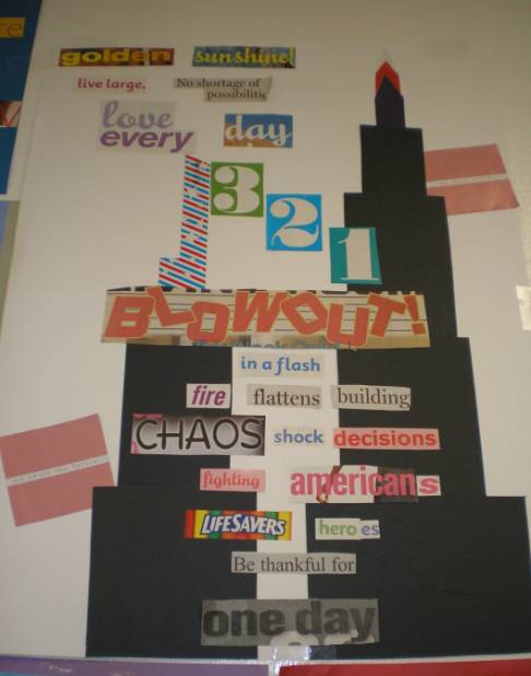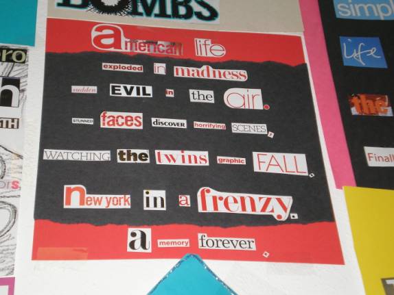 For several weeks, the junior English classes at Prairie High School read and reflected on the events of 9/11. Beginning with poetry, the students analyzed others’ thoughts and point of view. Then, they read the novel, Last Man Down by Richard Piccioto, which is a powerful account from the perspective of a New York firefighter, who was trapped in the World Trade Center collapse. To finish the 9/11 unit, students had to construct headline poetry. They used portions of headlines to create reflective poems about 9/11. Not only did they have to write from a specific point of view, they had to focus on eye appeal to make the poem like artwork. The poems turned out well, and the students demonstrated their creativity in this project. Enjoy these examples.