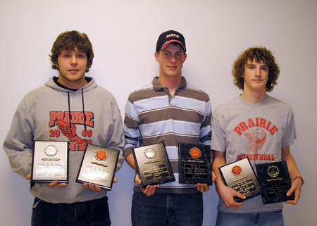 What was a pitcher’s duel for five innings turned into a wild game after the starters were lifted as Prairie beat Kamiah 8-5 in 8 innings Tuesday, March 13 at Kamiah. Kamiah starting pitcher Lee Harding allowed only 1 hit in 5 innings but he was matched by Prairie starter Ronnie Chandler who allowed just 2 hits in his 6+ innings of work. Conner Rieman had Prairie’s only hit off Harding, a single to right to lead off the fifth inning. Prairie had a scoring threat in the second as an error, hit batsman and walk loaded the bases with 2 outs but Harding got out of the inning with a groundout to first. Kamiah had a couple of scoring threats against Chandler including one in the first inning. The leadoff hitter doubled down the left field line and moved to third on a groundout. A fly out to left got Chandler out of the inning. An outstanding defensive play saved a run in the third. Chandler hit a batter with one out and the next hitter doubled to deep left center. Rieman fielded the ball and threw to cut-off man David Sigler. Sigler turned and fired a strike to home and the base runner was about by a mile as catcher Dan Riener applied the tag. In the sixth Prairie jumped on Kamiah’s relief pitcher. Chandler led off the inning and reached as the first baseman dropped the throw. After an out, Eric Daly and Nate Kaschmitter walked to load the bases. Rieman then drew a walk to force home the game’s first run. After a second out, Sigler singled to left with two runs scoring. Kyle Holthaus followed with a singled to left to score Rieman and Riener followed with a single up the middle that scored Sigler for a 5-0 Prairie lead. In the bottom of the seventh Chandler tried to get the complete game win but ran out of gas as a walk, dropped fly ball and another walk loaded the bases for Kamiah. Prairie wanted to go to Sigler to finish the game but he was hit by a pitch on his pitching arm earlier in the game. Holthaus was called on for his first varsity action. He gave up a 2 run single, got a comebacker for an out and then couldn’t find the strike zone as he walked a pair of hitters. Eric Daly was then called on to get out of the inning. He gave up a 2 run single that tied the game then struck out the next two hitters to send the game to extra innings. Kamiah again changed pitchers and gave and intentional walk to Riener. After a fly ball out to center by Chandler moved Holthaus from second to third, Ben Schumacher got an RBI with a ground out to second. Eric Daly continued to pitch in the bottom of the eighth and got two quick outs on a strikeout and groundout to short. Another grounder to short resulted in an error but Daly then got the final out on a groundout to second. Prairie wound up with 8 runs on just 5 hits. Holthaus had a pair of singles while Sigler, Riener and Rieman each had a single. Chandler pitched 6 plus innings of 2 hit baseball and was charged with the first 3 runs in the 7th. He had 2 walks and 3 hit batsmen with 5 strikeouts. Holthaus pitched 1/3 of an inning with 1 hit and 2 walks and gave up 2 runs. Daly pitched 1 2/3 innings allowing 1 hit and no walks with 3 strikeouts. The Pirates improved to 2-2 on the season. Prairie 0 0 0 0 0 5 0 3-8 5 4 Kamiah 0 0 0 0 0 0 5 0-5 4 4 David Sigler tosses no-hitter at CV David Sigler tossed a no-hitter with 13 strikeouts as the Prairie Pirates defeated an overmatched C.V. team 25-0 at Kooskia Thursday, March 15. Sigler allowed only 2 baserunners in the game. C.V. led off the game with a walk and in the third inning the #9 hitter reached on an error. Prairie meanwhile pounded out 19 hits and took advantage of 9 Rams errors to pile up 25 runs. They got 17 of them in the first inning as the first 17 hitters all reached base and scored. C.V.’s starter never did get an out as he faced 12 hitters giving up 4 hits, 3 walks and 2 hit batsmen while his defense committed 4 errors behind him. C.V. changed pitchers and the next 5 hitters all reached on 3 hits, a walk and an error before the first out was made. Prairie added 2 more hits before the inning was completed. Dan Riener had 3 hits in the inning, a single, triple and double while Sigler and Nate Kaschmitter had 2 hits each. In the fourth inning Prairie started subbing in reserves and managed to put another 6 runs up on the board thanks in large part to 3 errors. They added 2 more runs in the fifth as Kyle Daly led off with a double and Kaschmitter followed with a single up the middle. Daly scored on an error and Riener singled home Kaschmitter. Riener had 5 hits, a triple, double and 3 singles while Sigler wound up with 4 hits, a double and 3 singles. Kyle Daly had 2 doubles and single and Kaschmitter had a double and 2 singles. Joe Schumacher had a double and single and Ronnie Chandler and Andrew Gabica each had a single. With the win Prairie is 1-0 in league play and 3-2 overall. Prairie 17 0 0 6 2—25 19 1 C.V. 0 0 0 0 0— 0 0 9 Boys basketball award winners are shown. From left are J.D. Riener, most inspirational; Corey Schaeffer, Mr. Hustle and David Sigler, most valuable. All three were also co-captains. PHS BASEBALL March 5-Lewis County, there, 4:30 p.m. 7-Grangeville (V-JV), there, noon 10-Troy, here (2 games), 3 p.m. 12-Kendrick (V-JV), here, 3:30 p.m. 14-Council, there (2 games), noon MDT 17-Culdesac, here, 4:30 p.m. 20-Grangeville, here, 4 p.m. 23-C.V., here, 4:30 p.m. 24-Genesee, there, (2 games), 4 p.m. 26-Timberline, there, 4 p.m. 30-Lewis County, here, 4:30 p.m. 5-District 1st round, Gen. & Kendrick 11-12-District at Kendrick 18-19-State at Caldwell |