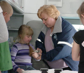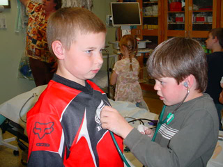 second photo Jared Sonnen and Jayce Huling are taking turns using the stethoscope