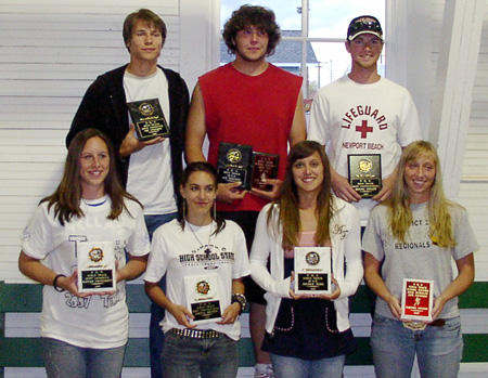 PHS track award winners are shown. Back from left are Vit Spanhel, boys most improved; J.D. Riener, boys most valuable and school record setter in the shot put and Daniel Sigler, boys most inspirational. Front from left are Kaylee Uhlenkott, girls most improved; Sienna Benton, girls most inspirational; Nicole Nida, girls most valuable and Tabitha Sonnen, school record setter in the 100 hurdles. |