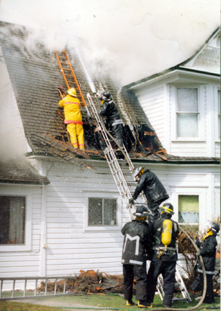 July 11, 2007 will mark the 100 year anniversary of the formation of the Cottonwood Volunteer Fire Department. The following are some excerpts from meeting minutes and records of the department throughout the years. There will be more history published each week prior to the anniversary. Fire Department Members The 1966 Fire Department Roster included: Les Reed, Fritz Nuttman, Bud Sager, Bill Nuxoll, Walt Ruhoff, Urbie Riener, Al Kaus, Dick Schultz, Mark Tacke, Don Hoene, Bernie Seubert, Fred Behler, Dave Gehring, Harold Duman, Vic Gehring, Willie Mader, Rich Becker, Cliff Holthaus, and Jim Toennis. Business Topics June 17,1939 – “After a short debate, it was decided that the Department turn out one evening to air out the hydrants all over the city in order to assure that they be found in working order when needed and to wash out any silt and dirt that may hinder a 100% smooth operation. This aforementioned move was also calculated to acquaint the Department as to locations of hydrants in their nocturnal dashes.” December 15, 1941 – “Discussions of blackout and air raid alarms were held at length. The Department established a temporary system of signals until a uniform or general system of signals is issued. For the present, five short blasts will signify the warning alarm or beginning of a blackout and one long blast will be the all-clear to cease the blackout.” March 10, 1947 – “Following the installation of the new hose, the boys were treated to a cup of coffee at the Stockman’s Bar. A check was issued for $1.00 against the Department for the treat.” December 19, 1960 – “The Department considered the purchase of a brand new engine with a 750 gpm capacity pump for a cost of $11,000 to $12,000. The trade-in value of the present 1941 pumper was estimated at $4,500.” September 19, 1995 – “Bob Michels moved to pay the bills, but there weren’t any.” October 20, 1997 – “”Greg Sonnen said no way he would be Secretary/Treasurer. Issue remains unresolved.” Fires & Emergency Response February 28, 1944 – “The Fire Department voted to thank Leo Schultz for gift of $5.00 following the fire at the Dairy Products plant.” August 12, 1947 – “Discussion was held as to whether the Department should give permission to Fred Funke to burn the rest of his fire damaged home. It was moved and seconded that no one be issued a permit to burn during fire season.” January, 1988 – “The 1987 summary of fires to the Rural Fire District reported charges of $280 for 11 fires and the use of 4 men at each.” November 21, 2005 – “We discussed the Pacific Cabinets fire and the extrication at Greencreek.” Fighting the Henry Remacle house fire. The Cottonwood Fire Department was able to come up with identifications (and a better quality photo) to go with this picture of the department in 1977. From left are Joe Harrison, Tom Riener, Everett Sonnen, Rich Beckman, Fritz Nuttman, Fred Behler, Rich Becker, Bernie Seubert, Willie Mader, Harold Bruegeman, Cliff Holthaus, Laurens VanEngelen, George Todd, Gary Chaffee, Steve Uhlorn and Kevin Kaschmitter. |