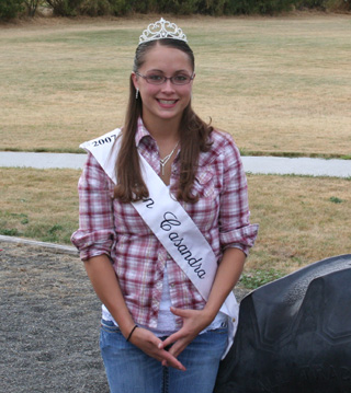 Queen Casandra The Prairie High School senior is the daughter of Lonnie and Collette Schaeffer of Ferdinand. Her grandparents are Harold and Carol Schaeffer, also of Ferdinand, and Lorenzo and Annabelle Gonzales of Cottonwood. She has one brother, Dustin, 15. Schaeffer has been involved in volleyball and track at PHS as well as TSA, Prairie League and Zoo Crew. She is currently employed by Hoene Hardware, volunteers at St. Mary’s Hospital and works special occasions at the Ferdinand Hall. Besides representing Idaho County, Schaeffer has had the opportunity to learn a few things during her reign. “I have learned to walk in high heels as well as how to balance myself on a moving trailer,” she laughed. “Most of all, I have learned a lot about myself as well as others, responsibility and teamwork.” Schaeffer is sponsored by the Keuterville Livestock 4-H Club where she is also a member. First Princess Jennifer First princess Jennifer Lynn Enneking, a senior from Prairie High School, is the daughter of Patrick and Lannette Enneking of Keuterville. She has three siblings: Jessica, 21, Bridget, 19, and Kenneth, 17. Her grandparents are Lorenzo and Annabelle Gonzales and Vivia Enneking of Cottowood. Enneking is active in school sports such as basketball and volleyball. She is the new vice president for the class of 2008, a member of the Zoo Crew, and a member of a drug-free group. Enneking encourages other girls to try out for this exciting experience. “There are many young girls who are capable of being royalty if you just set your mind to it.” She added, “…it’s not about letting your parents be there to do everything, but it gives you a chance to create something memorable and a chance to meet new people.” Second Princess Bonnie Reilly will be a senior at Grangeville High School this fall. She is the daughter of Tom and Sandra Reilly and has three brothers and two sisters: Patrick, 23, Anthony, 22, Thomas, 19, Tamara, 14 and Kara, 11. Reilly is a member of Lively Livestock 4-H Club and has been involved in her church youth group as well as cross country at GHS. She is employed by Cash and Carry Foods in Grangeville. Reilly said she ahs appreciated the opportunity to travel and share her faith as a Christian through her actions. “It’s also a wonderful experience to get to know other girls you may never have known otherwise,” she said. One memorable experience came when her father drove the truck pulling the float for the first time. “He slammed on the brakes so hard it made Casandra fall over,” she smiled. Reilly recently returned from Africa where she went to Nigeria for a church mission trip. The above articles are borrowed from the Idaho County Fair Premium Book and were written by staff members Lori Palmer and Sarah Yama of the Idaho County Free Press. The photos are by Chronicle photographer Greg Wherry. |
