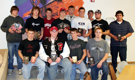 Shown are the award winners for the PHS football team. Front from left are Kyle Holthaus co-captain and honorable mention all-WPL quarterback; Ronnie Chandler, co-captain; Derek Schaeffer, JV defensive player of the year and Jason VonBargen, JV defensive lineman of the year. Back from left are Branden Waller, co-captain, defensive player of the year, 1st team WPL linebacker and honorable mention WPL offensive slot receiver; David Sigler, co-captain, Pirate of the Year, 1st team all-WPL wide receiver and 2nd team defensive back; Conner Rieman, defensive lineman of the year; Kyle Daly, co-captain, offensive player of the year and honorable mention all-WPL running back; Devin Schmidt, JV offensive player of the year; Kyler Shumway, offensive lineman of the year and 1st team all-WPL on both the offensive and defensive lines; Jon Rice, JV Pirate of the Year; Nick Johnson, co-captain, and J.C. Enriquez, JV offensive lineman of the year. PIRATES BOYS BASKETBALL SCHEDULE FOR 2007-08 *indicates league game 6-Highland, here 7-Lapwai, here 14-Christmas Tourn. Vs. Horseshoe Bend, 7:00 p.m. 15-Christmas Tourn. Vs. Council, 3:30 p.m. 20-Troy, there* 28-Orofino Tournament, TBA 29-Orofino Tournament, TBA 10-Culdesac, there* 12-Genesee, here* 17-Highland, there* 22-Grangeville, here 24-Nezperce, there* 29-Lapwai, there* 31-Timberline, here* 7-C.V., here* 11-Kendrick, here* 14,16,18,22,23-District at LCSC 27-March 1-State at Boise We'll have the wrestling schedule when it's available. |