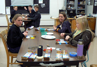 Junior High students working on their beading projects. At the front table from left are Ashley Ross, Ashley Shumway and Savanah Poxleitner. At the table in back are Troy Lorentz, Josh Zigler and Justin Schmidt. |