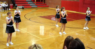 Prairie cheerleaders lead a cheer during the break