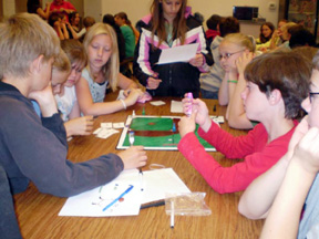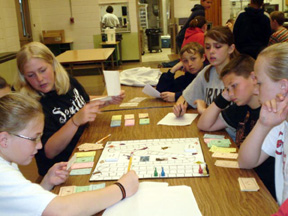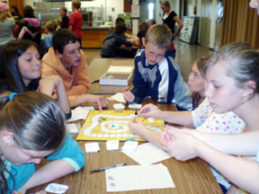 Colleen Sonnen’s 8th grade pre-algebra students ended their junior high math year with a bridge building competition. The rules were simple. The students had 8 days to build their bridge. The bridges were graded on design, neatness of construction, and clarity of the architect plans. The grades reflected if the teams followed their build code and if their checkbooks balanced with the audits given by the local “Sonnen Accounting Firm”. After being graded the bridges had one final test to go through, how much weight it will take to break them! The teams carefully set their bridges up on the platform to be broken. A system of a bucket and lead shot was the breaking device. Each bridge was broken and the winner, breaking at 94 7/8 pounds was Bob the Builder Team. The winning team members were: Makayla Schaeffer, McKenzie Candelot, Ashley Ross, Monica Lustig and Samantha Keating. The other bridges held 13 ½, 17 7/8, 23 ½, 29 7/8, 36 3/8 and 38 ¾ pounds. This project is multifaceted. It allows the students to learn teamwork, gives them a small incite to running a business, how to meet deadlines and different career opportunities. The math lessons include geometry, accounting, and a bit of physics. What a SMASHING WAY to end 2 great years of junior high math! Who likes to play board games? Who likes to play board games? Who likes math? Who thinks they can design a board game that will teach math concepts to other students? Those were the questions put before Colleen Sonnen’s 7th grade math students at Prairie Middle School. Groups were put through the paces of how to design and build a board game. They had to come up with a theme and math concepts that were grade level appropriate. The students designed the games for the 5th, 6th and 7th grade math classes. Some games dealt with money along with fractions, decimals, area, perimeter and integers. Themes ranged from baseball, a neighborhood alley, a tropical island, to “plungers and pipes,” One group even made a 7th grade classroom jeopardy game. Once the prototypes were ready the groups played each one looking for mistakes in math, refining the directions and making sure the games were ready for production. Games then were officially produced and boxed up for the big reveal day. On Thursday the 7th graders invited all the 5th and 6th graders to come and play! The cafeteria was filled with the sounds of dice rolling, laughter and excitement of getting a math question correct. Everyone got a chance to rotate through and play each of the board games, at the end of the morning the games were presented to the teachers as a classroom gifts for the next year. As one 7th grade stated “I had fun showing the younger kids that math can be fun. Board games are a cool way to learn math”.