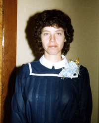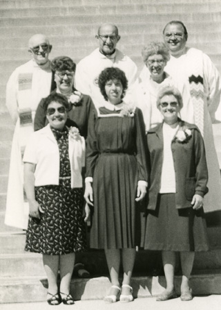 This photo shows Sister Janet Marie Barnard at her first monastic profession on June 25, 1983. Pictured in the photo are: front row left to right: Sister Barbara Gonzales, Sister Janet Marie Barnard, Sister Jean Lalande; 2nd row left to right: Sister Mary Geis, Sister Mary Marge Goeckner; Back row left to right: Father William Ordway, Bishop Sylvester Treinen, Father William Dohman. |