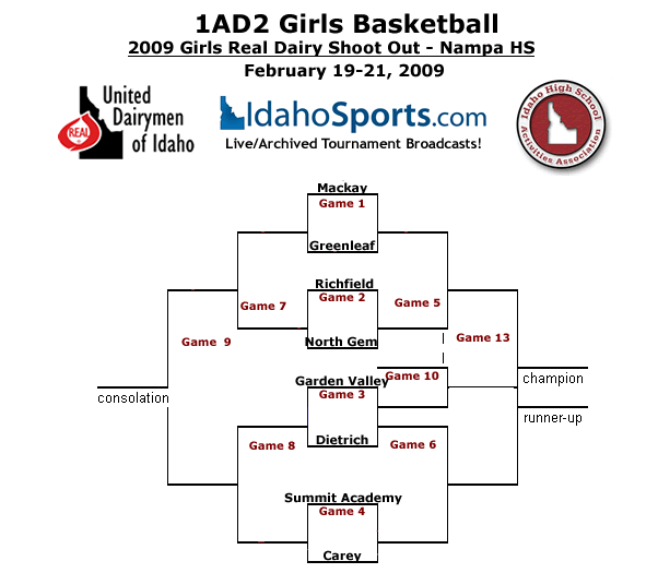 Shown is the 1-A Division 2 girls basketball bracket. Game 4 starts at 8 p.m. MST. Game 6 on Friday is at 3 p.m. while game 8 is at 8 p.m. Game 13, the championship game, is at 9:30 a.m.. Game 9, the consolation championship is at 9:15 a.m. Game 10, the 3rd place game is at 11 a.m. All games except the championship game are at Nampa High School. The championship game will be at the Idaho Center. Patriots win District opener The Summit Academy Patriots raced to an 11-0 lead and never looked back as they won their first ever boys district tournament basketball game 72-56 over Culdesac Saturday, Feb. 14 at Highland High School in Craigmont. Dustin Lustig got things off to a hot start by hitting a pair of 3-pointers. Summit’s full-court pressure then helped them build their lead to 18-3 as Josh Frei made 5 of his game-high 7 steals in the opening quarter nearly all of which led to easy scores for the Patriots. Lustig wound up scoring 9 in the opening quarter while Dylan Prigge scored 7 and Frei 5 as Summit took a 26-14 lead by the end of the period. Summit kept up the offensive pressure in the second quarter as they had a 21-4 run with David Johnson scoring 7 points and Dustin Lustig and Prigge 6 points each as the Patriots built their lead to 47-18. Culdesac bombed in a couple of 3’s at the end of the half to make it 47-24 at the break. Prigge and Dustin Lustig each added 6 more points in the third quarter as Summit built their lead to 63-35 after 3 quarters. They led 70-37 in the fourth when they emptied the bench and let the freshman play the final 5 minutes. Culdesac finished the game with a 2-19 run that made the final score much closer than the game actually was. Dustin Lustig scored 23 points to lead the Patriots in scoring while Prigge scored 19 and Johnson 14. Frei scored 9, Chase Nuxoll 5 and Joseph Lustig 4. Summit also dominated the boards by a 52-32 count. Nuxoll had 15 rebounds to lead the Patriots while Dustin Lustig had 11 and Johnson 10. In addition to Frei’s 7 steals, Dustin Lustig had 5 and Prigge 3. Dustin Lustig also had 4 assists. Levi Parmer led Culdesac with 20 points, 17 in the first half, while Bradley Layes had 19. Summit was In addition to Frei’s 7 steals, Dustin Lustig had 5 and Prigge 3. Dustin Lustig also had 4 assists. Levi Parmer led Culdesac with 20 points, 17 in the first half, while Bradley Layes had 19. Summit was 31 for 80 from the field, 39%, and 8 for 14 at the line, 57%. Culdesac was 22 for 52 from the field, 42%, and 5 for 8 at the line, 64%. Summit 26 21 16 9 -72 Culdesac 14 10 11 21 -56 Summit Academy-J. Lustig 1-4, 2-2, 4; D. Lustig 10-21, 1-2, 23; Prigge 8-20, 3-4, 19; C. Nuxoll 2-7, 0-0, 5; Frei 4-10, 0-0, 9; Johnson 6-16, 2-6, 14; Chmelik 0-2, 0-0, 0; D. Nuxoll 0-0, 0-0, 0; Schlader 0-0, 0-0, 0; Rehder 0-0, 0-0, 0. 3-pointers-D. Lustig 2, C. Nuxoll, Frei. Culdesac-Miller 1-4, 1-2, 3; Layes 8-16, 1-1, 19; Parmer 8-15, 1-2, 20; Lane 1-8, 0-0, 2; Kegley 0-0, 0-0, 0; Bomar 2-5, 0-0, 5; Dawes 2-4, 0-0, 5; Marcell 0-0, 2-2, 2. 3-pointers-Parmer 3, Layes 2, Bomar, Dawes. Nezperce beats Summit in District title game The Summit Patriots ran into a buzzsaw in the District 2, 1-A Division 2 championship game as they lost 33-62 Monday, Feb. 16 at Highland High School in Craigmont. Summit had all kinds of trouble getting into their offense as Nezperce made an effort to take Dylan Prigge’s low post game away, doubling him every time he got the ball down low. He was limited to just 2 shot attempts in the first half and scored just 2 points on a pair of free throws. Summit trailed 6-16 after the first quarter and 15-31 at the half, hitting just 3 of 10 shots from the field in each quarter. Nezperce didn’t let up any in the third quarter as they scored the first 10 points of the second half with 9 of those coming on 3-point shots by Leitch. Summit managed to outscore Nezperce 7-4 the rest of the quarter but trailed 22-44 after 3 periods. Nezperce opened the fourth quarter with a 2-11 run to push their lead to 31. By then both benches had emptied and the remainder of the game was played by the substitutes from both teams. David Johnson came off the bench to lead the Patriots in scoring with 9 points while Prigge scored 8. Derek Nuxoll and Austin Chmelik scored 4 each while Dustin Lustig scored 3, Chase Nuxoll and Josh Frei 2 each and Joseph Lustig 1. Summit hit 13 of 40 from the field, 32%, and 7 of 10 at the line, 70%. Nezperce was 21 for 52 from the field, 40%, and 13 for 19 at the line, 68%. As a team they hit eight 3-pointers while Summit had none. Summit beat Culdesac Tuesday, Feb. 17 and will play at 6 p.m. on Friday at the Bear Den in Moscow. Nezperce plays at 7:30 p.m. Friday’s losers play at 2:30 on Saturday with the winners playing at 1:00. The 2:30 winner plays the 1:00 game loser at 7 p.m. for second place at Regionals and a chance to advance to state through a play-in game set for Saturday, Feb. 28 at Grangeville at 5 p.m. Summit 6 9 7 11 -33 Nezperce 16 15 13 18 -62 Summit-J. Lustig 0-3, 1-2, 1; D. Lustig 1-6, 1-2, 3; Johnson 4-8, 1-2, 9; Prigge 3-8, 2-2, 8; C. Nuxoll 1-2, 0-0, 2; Frei 1-3, 0-0, 2; Schlader 0-1, 0-0, 0; D. Nuxoll 2-2, 0-0, 4; Chmelik 1-2, 2-2, 4; Rehder 0-3, 0-0, 0. 3-pointers-none. Nezperce-C. Riggers 1-8, 0-0, 2; Leitch 9-13, 7-10, 30; Scott 3-9, 0-0, 8; Zenner 2-3, 0-0, 4; Fuchs 1-6, 1-3, 3; S. Wahl 0-1, 2-2, 2; Killmar 0-0, 1-2, 1; Carpenter 1-1, 1-2, 3; Mizer 1-1, 0-0, 2; Long 0-2, 0-0, 0; R. Wahl 0-2, 0-0, 0; Wemhoff 1-1, 0-0, 2; J. Riggers 2-5, 0-0, 5. 3-pointers-Leitch 5, Scott 2, J. Riggers. January Boys Regionals at Moscow Feb. 20 and Lewiston Feb. 21. Boys State March 5-7 |