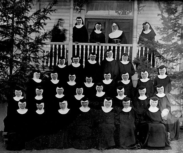 St. Gertrude's community on the steps of the original wooden convent, 1909.