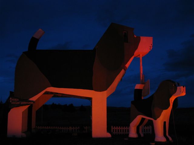 Along with the Empire State Building, Niagara Falls, Graceland and other prominent US landmarks and iconic buildings, the big beagle at Dog Bark Park in Cottonwood lit up orange on April 7th for the American Society for the Prevention of Cruelty to Animals Go Orange for Animals awareness campaign. April is Prevention of Cruelty to Animals month and orange is the association’s signature color. When a researcher from the ASPCA headquarters in New York contacted Dog Bark Park owners Dennis Sullivan and Frances Conklin about taking part in the Go Orange campaign “we jumped at the chance to participate”, says Conklin. “What better building than Idaho’s famous dog to champion the work of the ASPCA while at the same time draw national attention to Idaho and Idahoans.” The ASPCA will hold several gala events in major US cities as well as pet parades, photo contests & pet education programs during April. Go Orange for Animals television coverage is scheduled throughout the month including the Today Show and the Martha Stewart Show The big beagle, located on US Hwy 95 just south of the north entrance to Cottonwood, will be lit in orange several hours each evening during April. “Finding orange theatrical gel & figuring how to secure it over outdoor floodlights was a bit of a challenge, but we’re set to be orange all month now,” reports Sullivan. For more information about the ASPCA & a complete list of Go Orange locations, visit www.ASPCAApril.org. The beagles lit up in orange for the ASPCA |