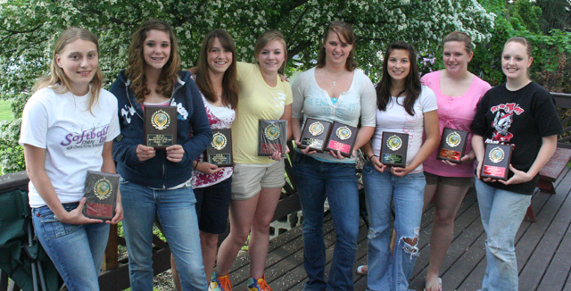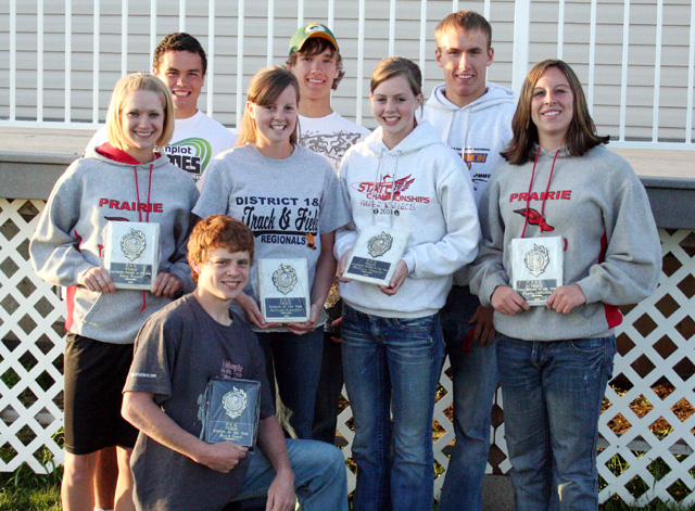 Above are the PHS softball award winners. From left are Leora Laurino, senior co-captain; Sammi Frei, defensive player of the year; Megan Sigler, most improved; Rachel Kaschmitter, senior co-captain; Kara Guyer, offensive player of the year and senior co-captain; Amber Holthaus, most inspirational; Emily Lerandeau, senior co-captain and Camille Schumacher, senior co-captain. Not shown is Mariah Evans, senior co-captain. The PHS track team award winners are shown. In front is the boys team “runner of the year,” Brock Heath. Girls winners from left are Katie Nuxoll, “best all around,” NaTosha Schaeffer, “runner of the year,” MaKayla Schaeffer, “rookie of the year,” and Kaylee Uhlenkott, “field event athlete of the year.” Back from left are boys winners Kyler Shumway, “field event athlete of the year,” Justin Schmidt, “rookie of the year” and Devin Schmidt, “best all around.” |