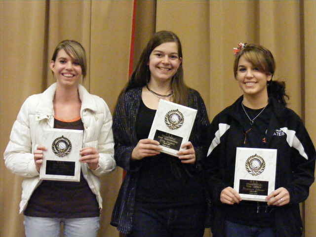 Plaque winners for the Prairie volleyball team presented at their awards banquet Wednesday, October 28. From left are Sam Poxleitner, most improved; Gina Seubert, most inspirational and Francesca Johnson, team captain. Photo by Laurie Workman. 2009-2010 Girls Basketball Schedule November 19th-Away Grangeville 6:00 30th-Home Kamiah 6:00 10th-Home Lewis Co.* 6:00 12th-Away Timberline* 1:00 15th-Home Lapwai * 6:00 19th-Home Genesee* 1:00 22nd-Home Potlatch* 1:00 29th & 30th-Away Kamiah Tour. TBA 8th-Away Deary* 6:00 9th-Home Culdesac (varsity only) 6:00 12th-Home Troy* 6:00 14th-Home Orofino 6:00 16th-Away C.V.* 1:00 19th-Away Kendrick* 6:00 22nd-Home Kamiah 4:00 28th-Away Genesee 6:00 18,19,& 20-Away State-Boise TBA *League Game |