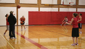 New Prairie girls basketball coach Rusty Lorentz said the team will look more for the transition baskets and he wants them to take the good open shot when they have it. There are 26 players out for the team this year. He said they’re a little shy on size with senior post Mary Shears being their only real post presence. They would’ve had Hilaree VanderPas but for the second straight year she hurt her knee on the first day of practice. Seniors Shears, Amber Holthaus and NaTosha Schaeffer junior Kayla Johnson and sophomore Megan Sigler are the only returnees with much varsity experience Junior Francesca Johnson is also likely to start and sophomore MaKayla Schaeffer will also see a lot of playing time and would start in the season opener with Holthaus missing that game for a family event. Juniors Meaghan Bruner and Haleigh Schmidt saw time on the varsity last year for tournaments while sophomores Sam Keating and Demetria Riener will play both varsity and JV this year. New JV coach Sarah Walsh has 11 freshmen in the mix along with 5 sophomores and 1 junior. They will try to get some C games scheduled to give some of the freshmen more playing time but there are very few area schools with C teams this year. Betty Clark is the lone junior on the JV team with sophomores Riener and Keating along with Jenny Gimmeson, Amanda Stinson and Leslie Nida. Freshmen are Callie Mader, Tanna Schlader, Tyler Workman, Stephanie Gimmeson, Taylor Heitman, Kendal Schumacher, Cheryl Gehring, Amanda Dinning, Shelby VonBargen, Claire Whitley and Hope Vanator. The team was to play their season opener this past Tuesday against Lewis County at Nezperce. They will play next at Grangeville on Thursday, Nov. 19 then take a long break for Thanksgiving before playing their home opener against Kamiah on Monday, Nov. 30 at the Middle School gym. They hope to be able to play their first game on the new high school floor on Friday, Dec. 4 against Grangeville. Lorentz said Lapwai and C.V. should be tough in the league this year and that Genesee looked very good in their season opener against Lewis County. He said the girls are having fun so far and are looking forward to getting the season started. New head coach Rusty Lorentz watches most of the varsity starters go through a passing drill. Megan Sigler passes while Mary Shears is about to make a pass. At right are NaTosha Schaeffer and Fran Johnson. In the background is Sam Keating retrieving the ball as the rest of the varsity players were going through the same drill. 2009-2010 Girls Basketball Schedule November 19th-Away Grangeville 6:00 30th-Home Kamiah 6:00 10th-Home Lewis Co.* 6:00 12th-Away Timberline* 1:00 15th-Home Lapwai * 6:00 19th-Home Genesee* 1:00 22nd-Home Potlatch* 1:00 29th & 30th-Away Kamiah Tour. TBA 8th-Away Deary* 6:00 9th-Home Culdesac (varsity only) 6:00 12th-Home Troy* 6:00 14th-Home Orofino 6:00 16th-Away C.V.* 1:00 19th-Away Kendrick* 6:00 22nd-Home Kamiah 4:00 28th-Away Genesee 6:00 18,19,& 20-Away State-Boise TBA *League Game |